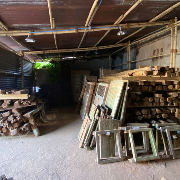 Timber elements including door and window shutters, frames, rafters and wall plates, full and half bricks, plaster and mortar samples and household objects recovered during dismantling have been systematically stacked in a material shed on the open ground at the site. The bamboo structure rests on a plinth built by reusing some of the salvaged brickbats. Roofing sheets from the rear wing were reused as enclosure for the structure. Debris has also been collected at the site for subsequent reuse. The shed will eventually be developed as a Material Archive for the Site School.